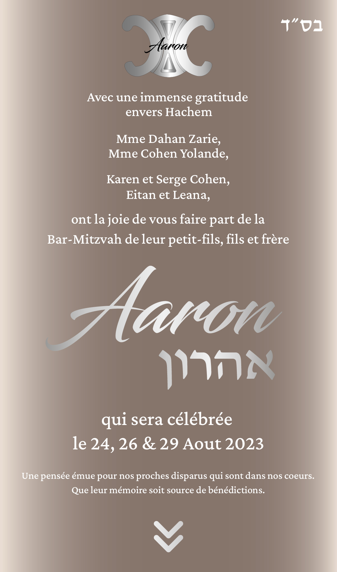Nous serons heureux de partager ce moment avec vous le Jeudi 24 Aout 2023 à 8h45 précisesEn la Synagogue Chasseloup-Laubat 14 rue Chasseloup-Laubat75015 Paris L'office sera suivi d'un Brunch